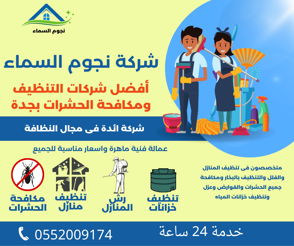 نجوم السماء هى افضل شركة مكافحة حشرات بجدة واختيارك الصحيح من بين العديد من شركات مكافحة الحشرات بجده ، والاولي بدليل شركات مكافحه حشرات بجده منذ عشرات السنين فهى متخصصة فى رش المبيدات و مكافحه الحشرات و اصطياد الفئران ومكافحه بق الفراش و الصراصير و مكافحه العته و مكافحه الناموس و مكافحه النمل الأبيض و مكافحه الفئران، كما انها افضل شركة ابادة حشرات بجده والتى تستخدم افضل مبيدات رش الحشرات والقضاء على الحشرات نهائياً ،فمع شركة رش مبيدات الحشرات بجده سيصبح منزلك خاليا من جميع الحشرات ، كما اننا ارخص شركة مكافحة حشرات بجده موجودة من بين العديد من شركات مكافحة و رش المبيدات بجدة